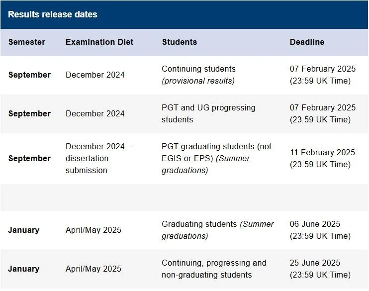 Registry and Academic Support will release all final and provisional results online to graduating and continuing students by the following deadlines: